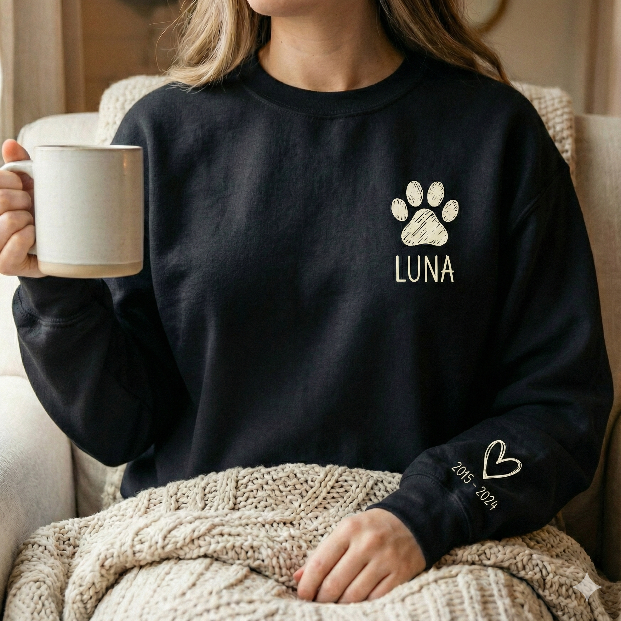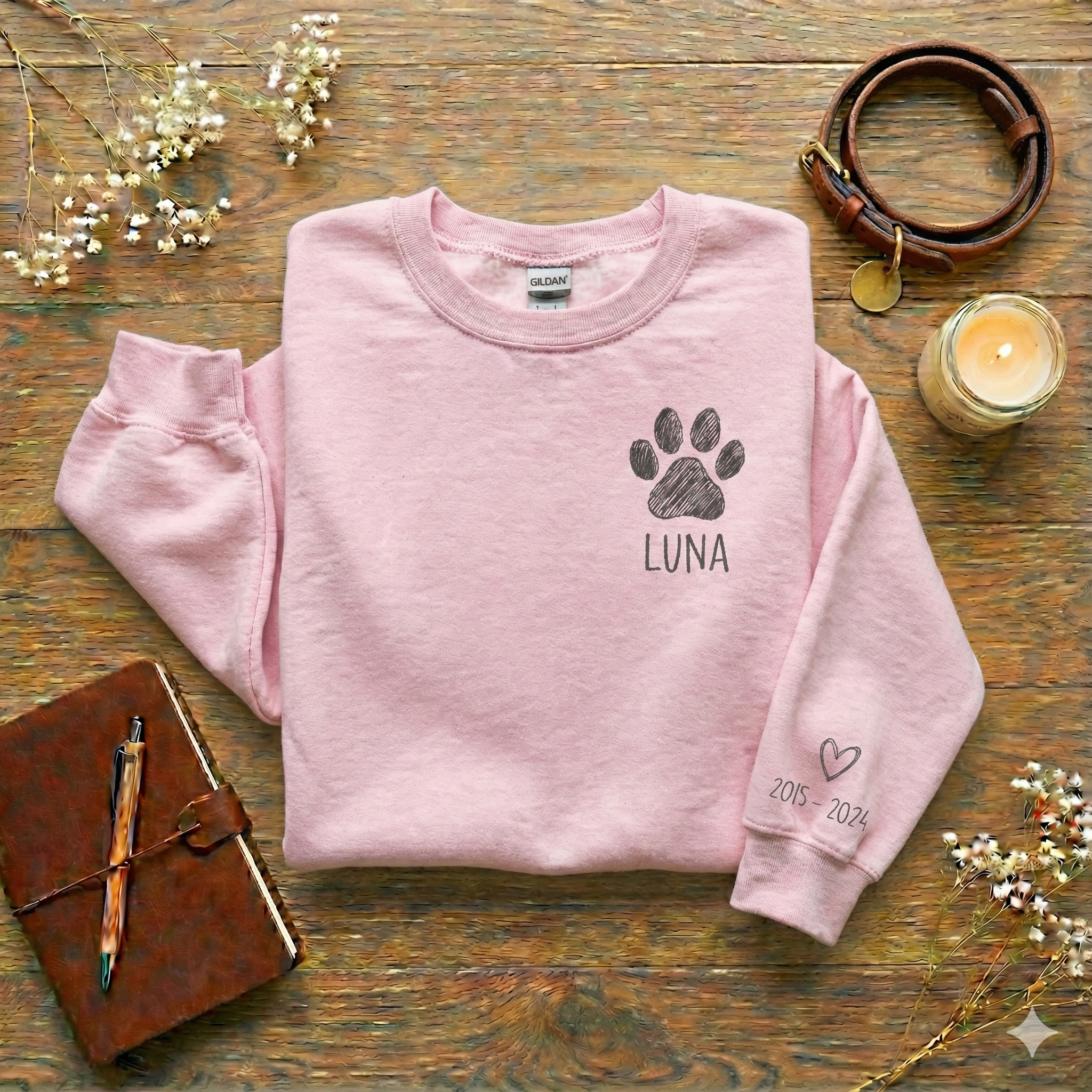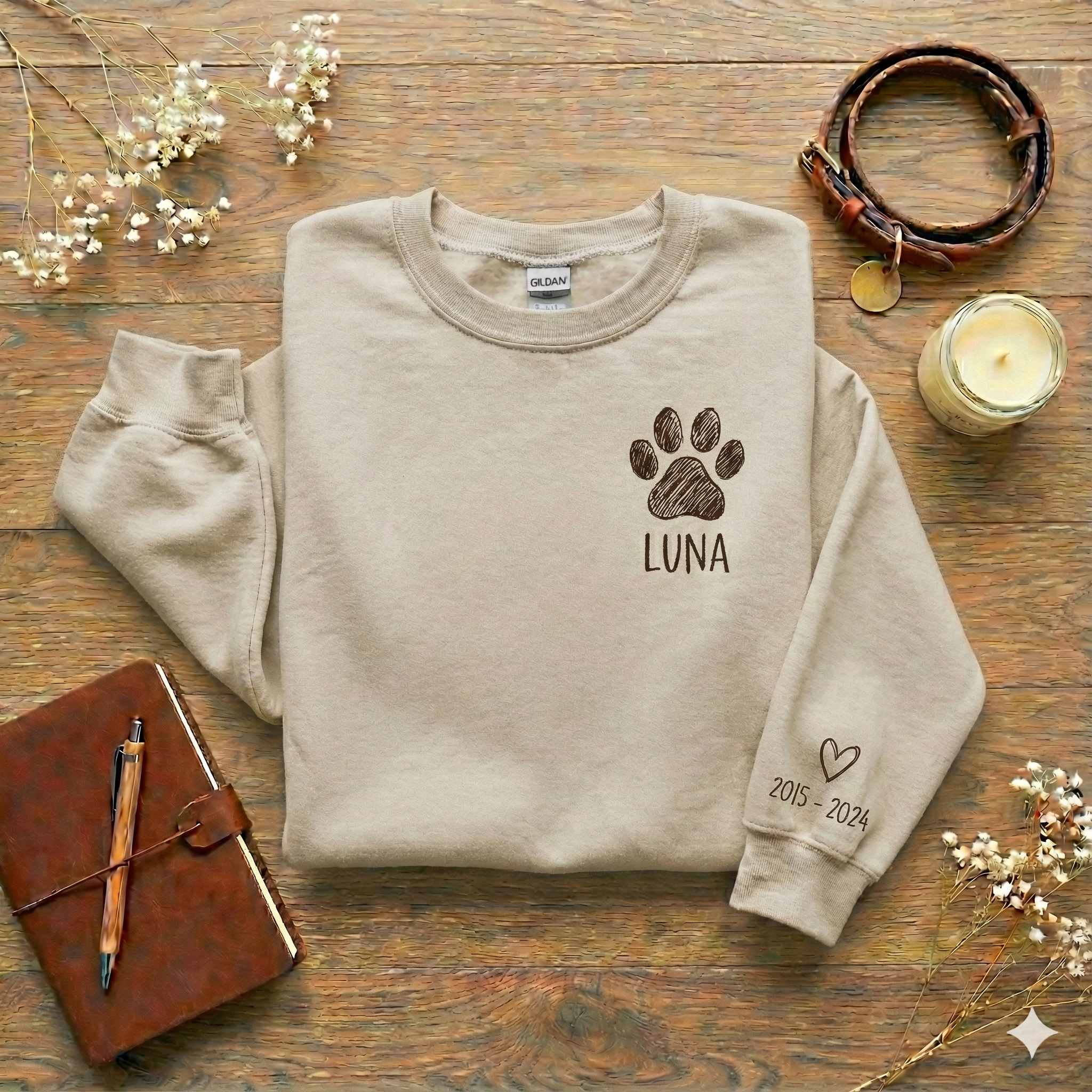 - Meaningful Personalized Design: Add your dog’s name and their years of life (e.g., 2015–2024). The front features a hand-drawn paw print, while the sleeve carries a subtle memorial heart and dates.
