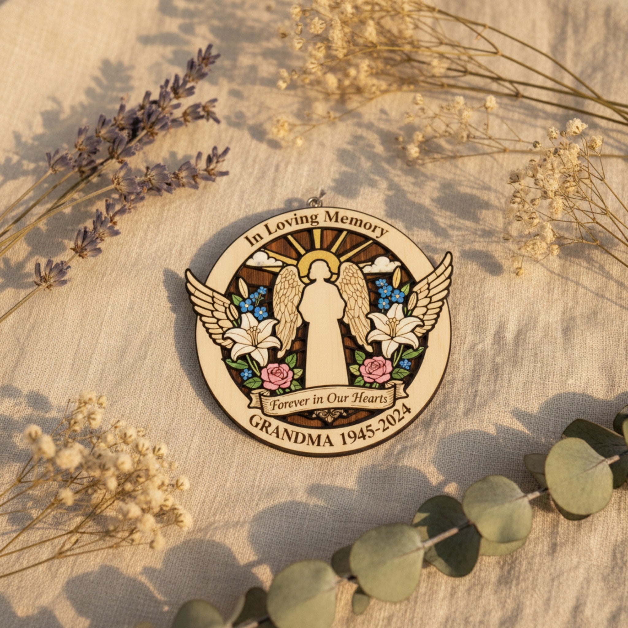 This memorial piece is crafted from high-quality, environmental-friendly fiber wood. The two-layer construction has a total thickness of 6mm, providing a sturdy and substantial feel. The ornament measures approximately 3.54 inches (9 cm) in diameter, making it a noticeable and heartfelt addition to your decor.