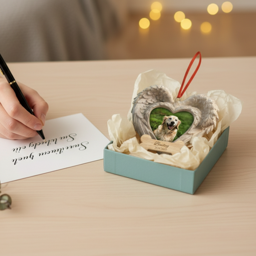 The Memorial Heart Wings Ornament for Pet Lovers – Custom Photo Wooden Keepsake turns remembrance into art. Carved with detailed angel wings embracing a heart-shaped frame, it holds your pet’s photo and name within a smooth wooden bone plaque. A gentle way to celebrate unconditional love and keep their memory shining on your holiday tree.