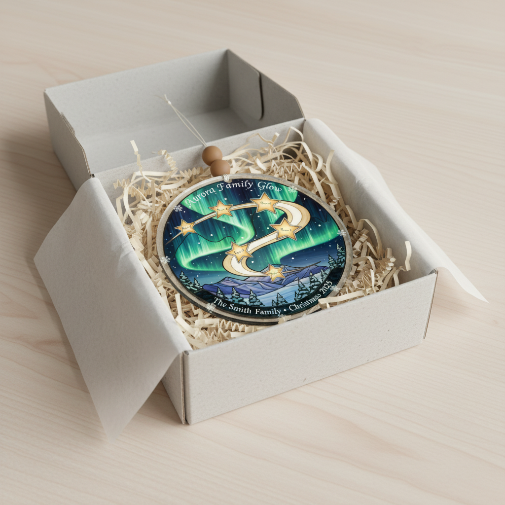 Capture your family's unique bond under the magical glow of the northern lights with this personalized family ornament, a stunning keepsake to treasure for generations to come.