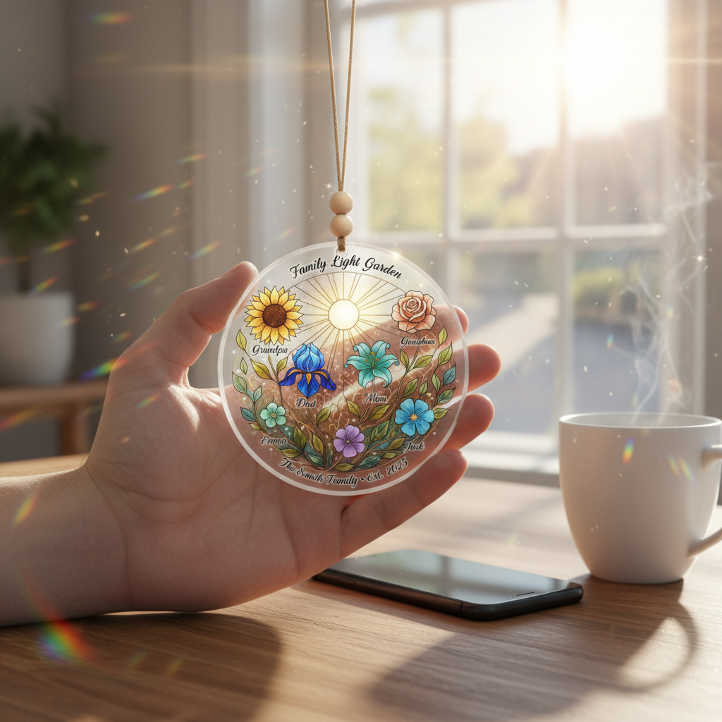 Celebrate the beautiful bonds of your multigeneration family with this stunning personalized family ornament, a unique keepsake that captures each member's unique light in a beautiful garden design.