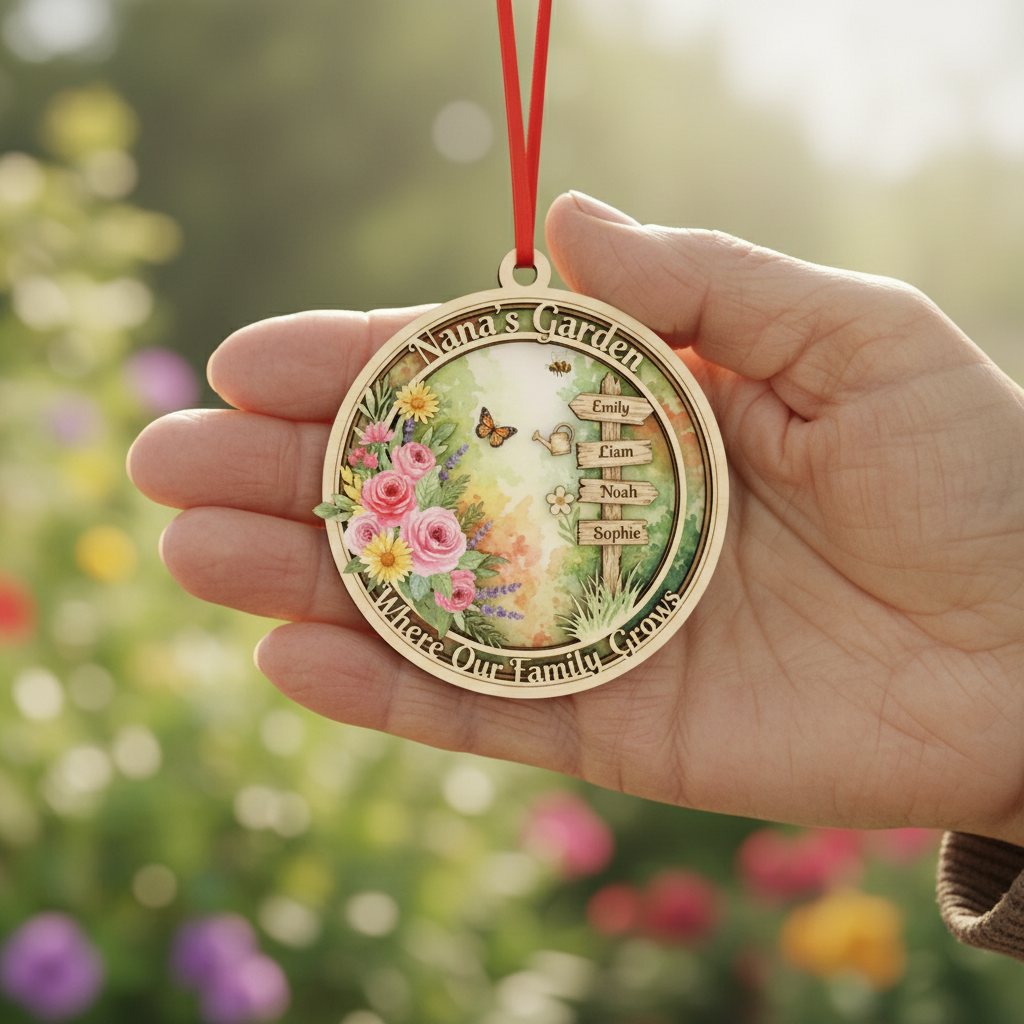 - Celebrate Nana’s love with a personalized wooden ornament featuring her grandkids’ names on garden signposts—symbolizing the path where family roots grow strong and memories bloom.