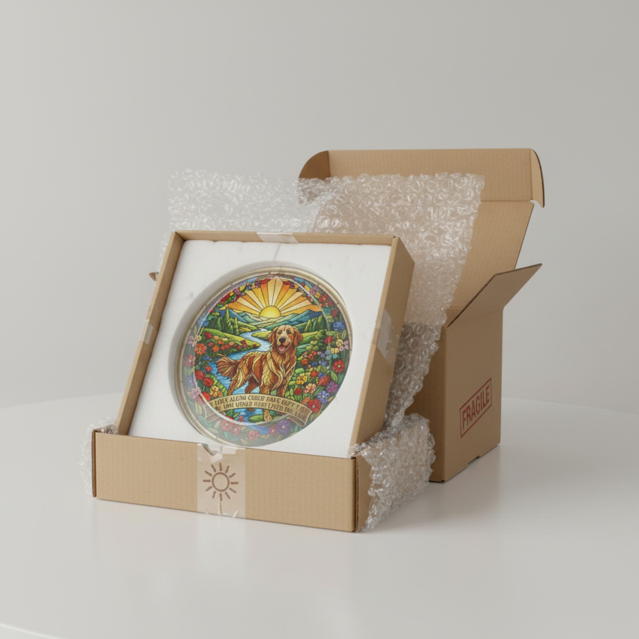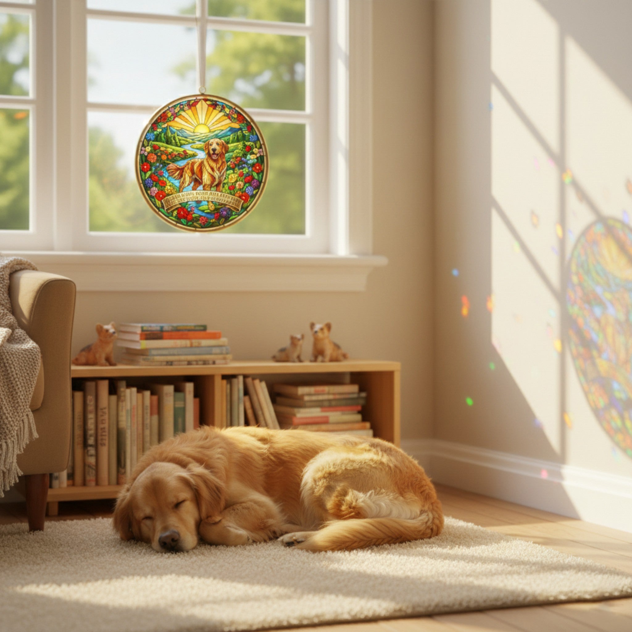 Keep your cherished Golden Retriever's memory shining bright with this beautiful personalized suncatcher. A touching stained-glass style tribute for any pet lover to honor their loyal companion's spirit.