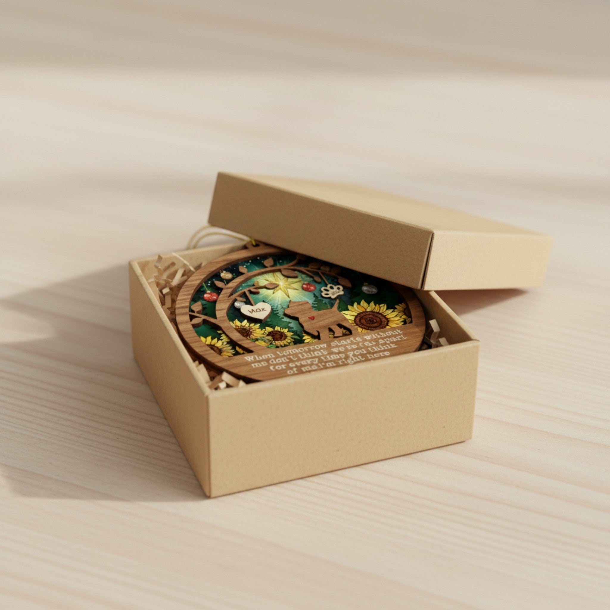 - Layered Memorial Design: Features a beautiful forest and sunflower scene with a pet silhouette, crafted from layers of natural wood and clear acrylic for a stunning 3D effect.