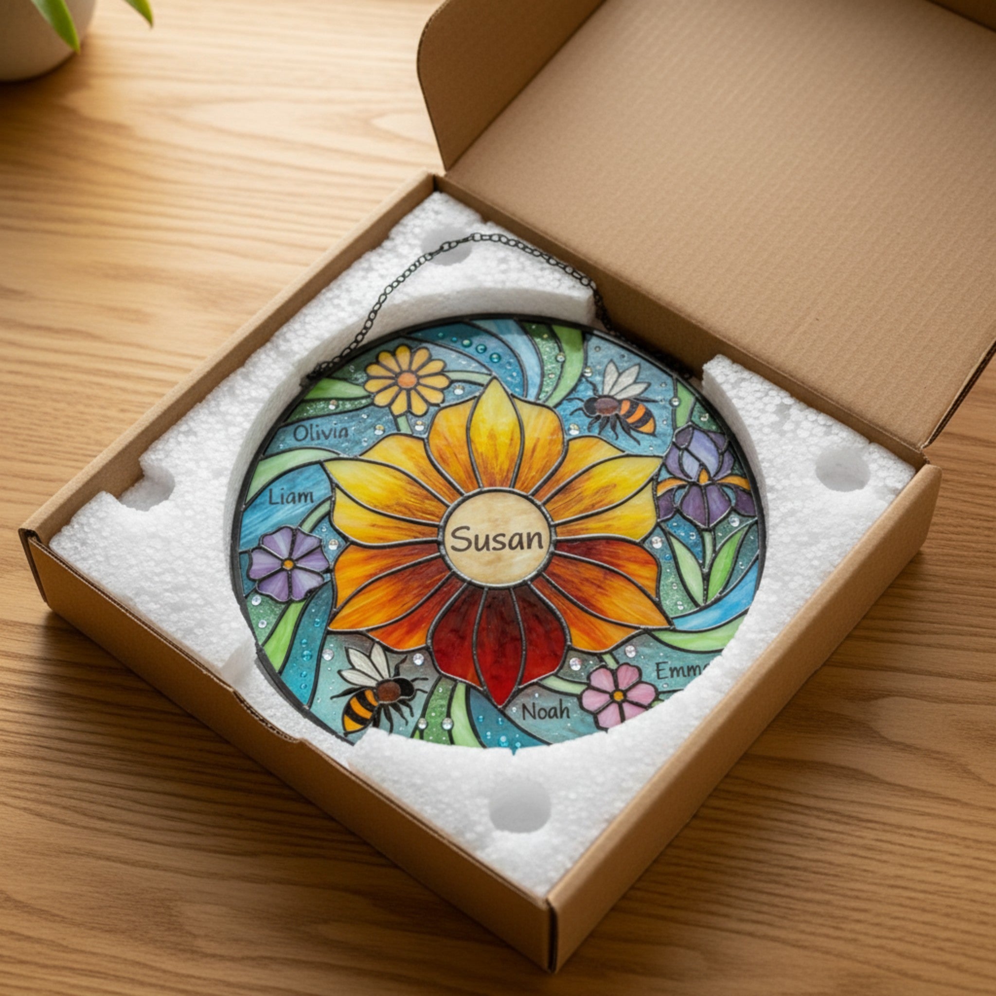 Watch Grandma's face light up with this beautiful ‘Garden of Love’ Stained Glass Suncatcher, a vibrant keepsake that beautifully displays the names of her beloved grandchildren in a dazzling display.