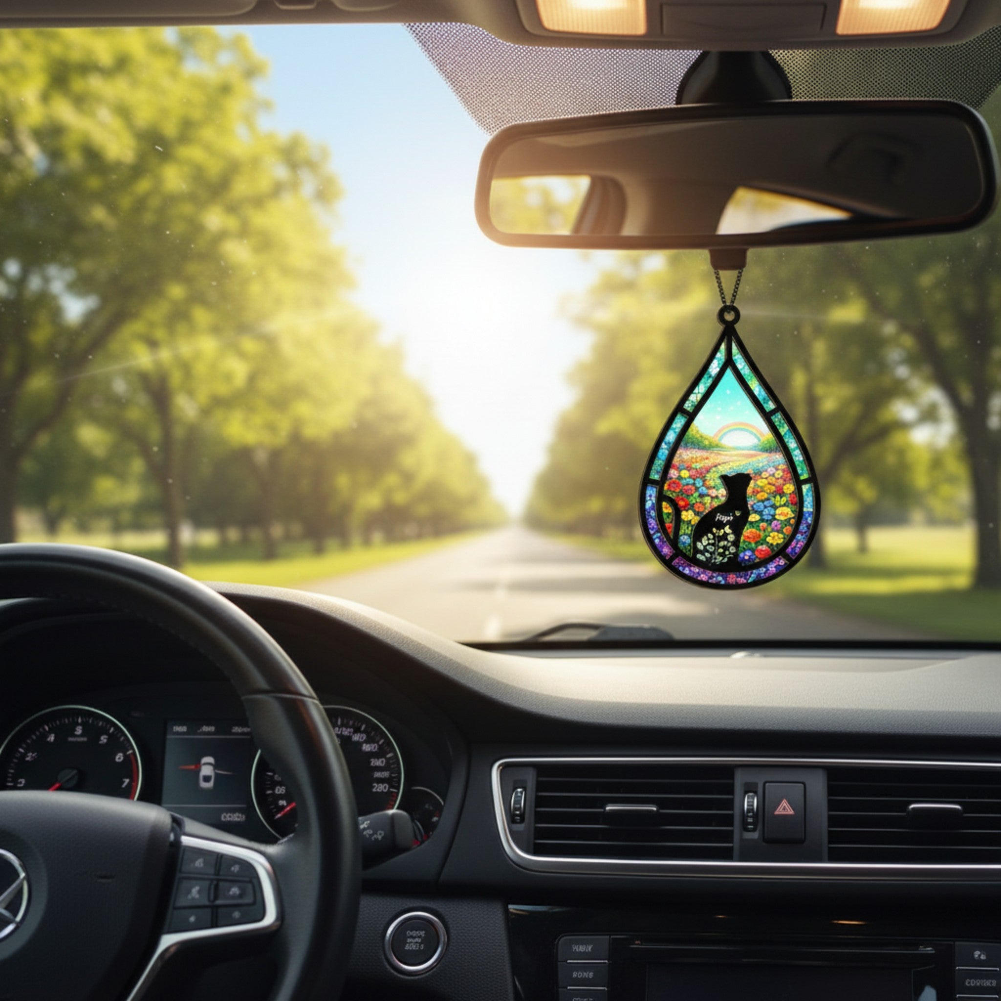 - Heartfelt Memorial Design: Features a serene pet silhouette against a vibrant field of flowers and the Rainbow Bridge, all within an elegant teardrop shape with a stained-glass style border.
