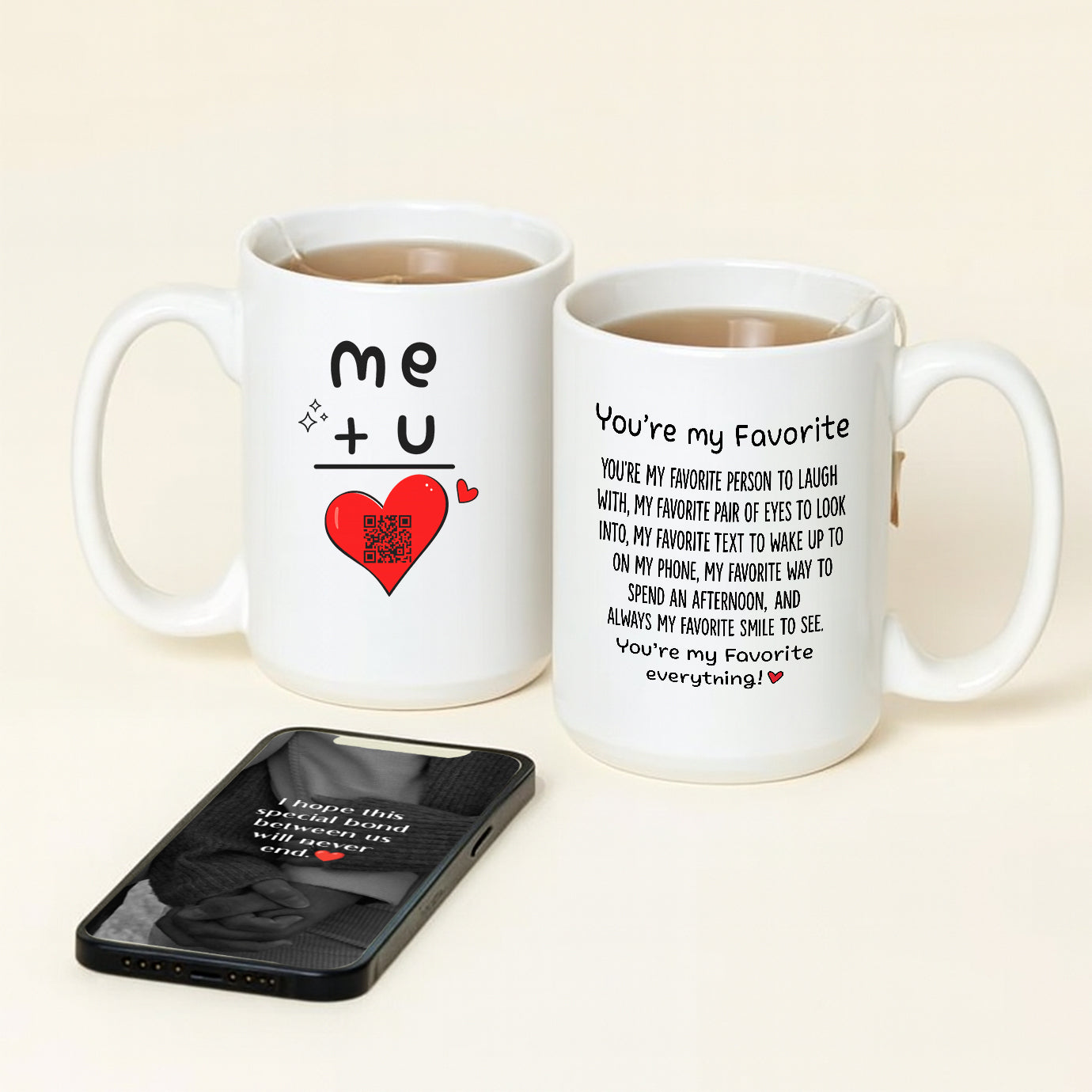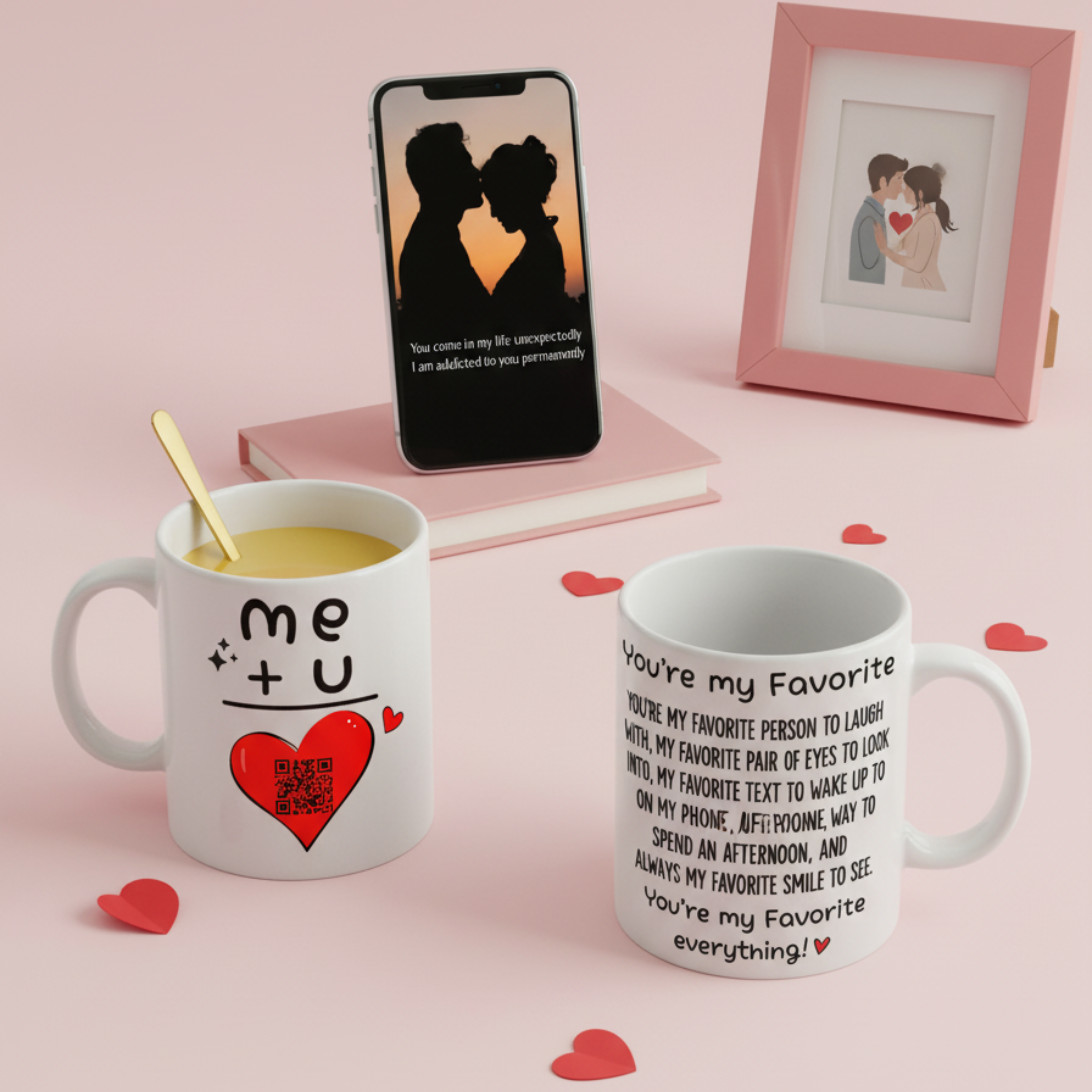 One ceramic mug, two‑sided print (“me + u” front + quote back) with a shared heart QR code linked to rotating messages.
