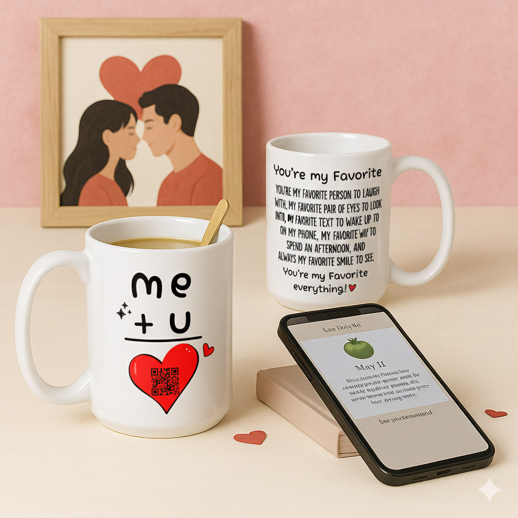 Make every sip a moment of connection. This two‑sided mug pairs a minimalist “me + u” front with a heart‑placed QR code and a romantic quote on the back. Scan the QR with your phone camera to open a mobile landing page; each scan reveals a rotating love note that encourages smiles, gratitude, and little check‑ins throughout the day. No name input needed—every mug ships ready to scan straight out of the box, delivering a shared experience for two. Perfect for anniversaries, Valentine’s Day, Christmas, housewarmings, or any just‑because moment.