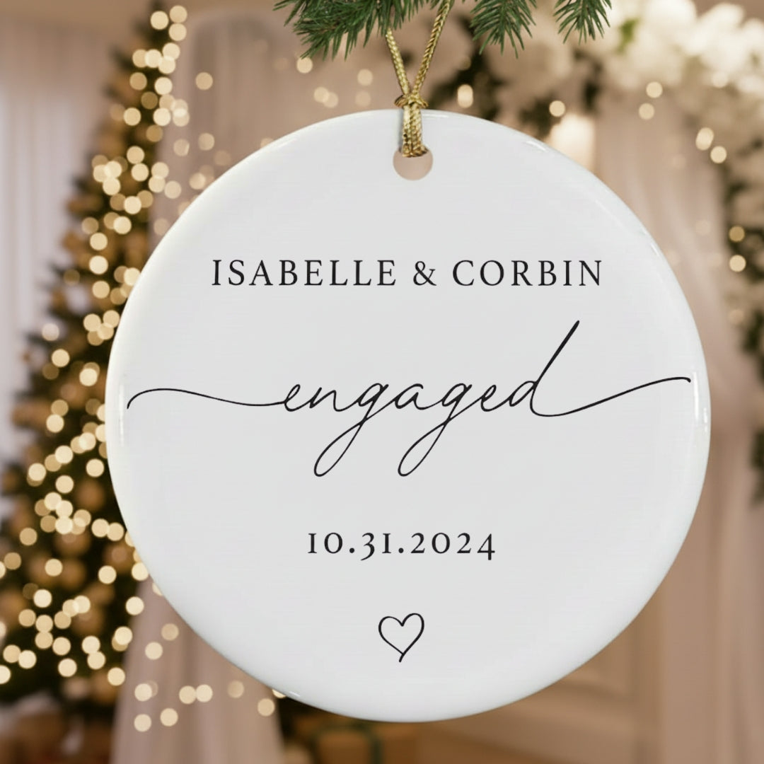 Commemorate the moment you said “yes” with this elegant ceramic engagement ornament, thoughtfully designed to capture the start of your forever. Featuring your names, engagement date, and the graceful script “Engaged,” this timeless design blends simplicity and romance in a way that feels effortlessly modern. Personalized to reflect your unique love story, it makes a meaningful keepsake to cherish for years to come. Each ornament is beautifully crafted from premium white ceramic, printed with rich, lasting color, and finished with a glossy surface that shines beautifully under holiday lights. Whether displayed on your Christmas tree or gifted to a newly engaged couple, this ornament is a heartfelt way to celebrate love, commitment, and the joy of new beginnings.