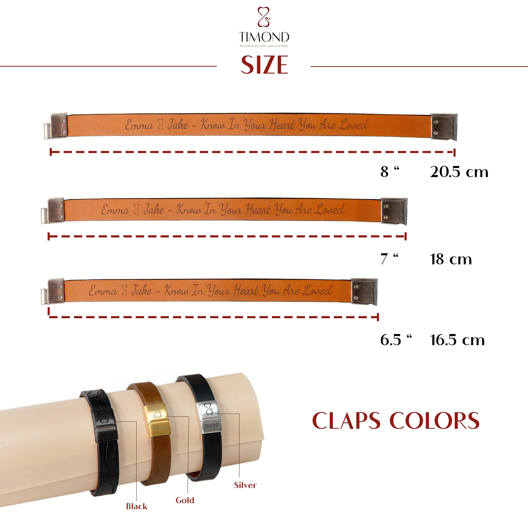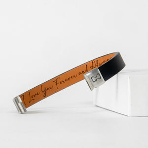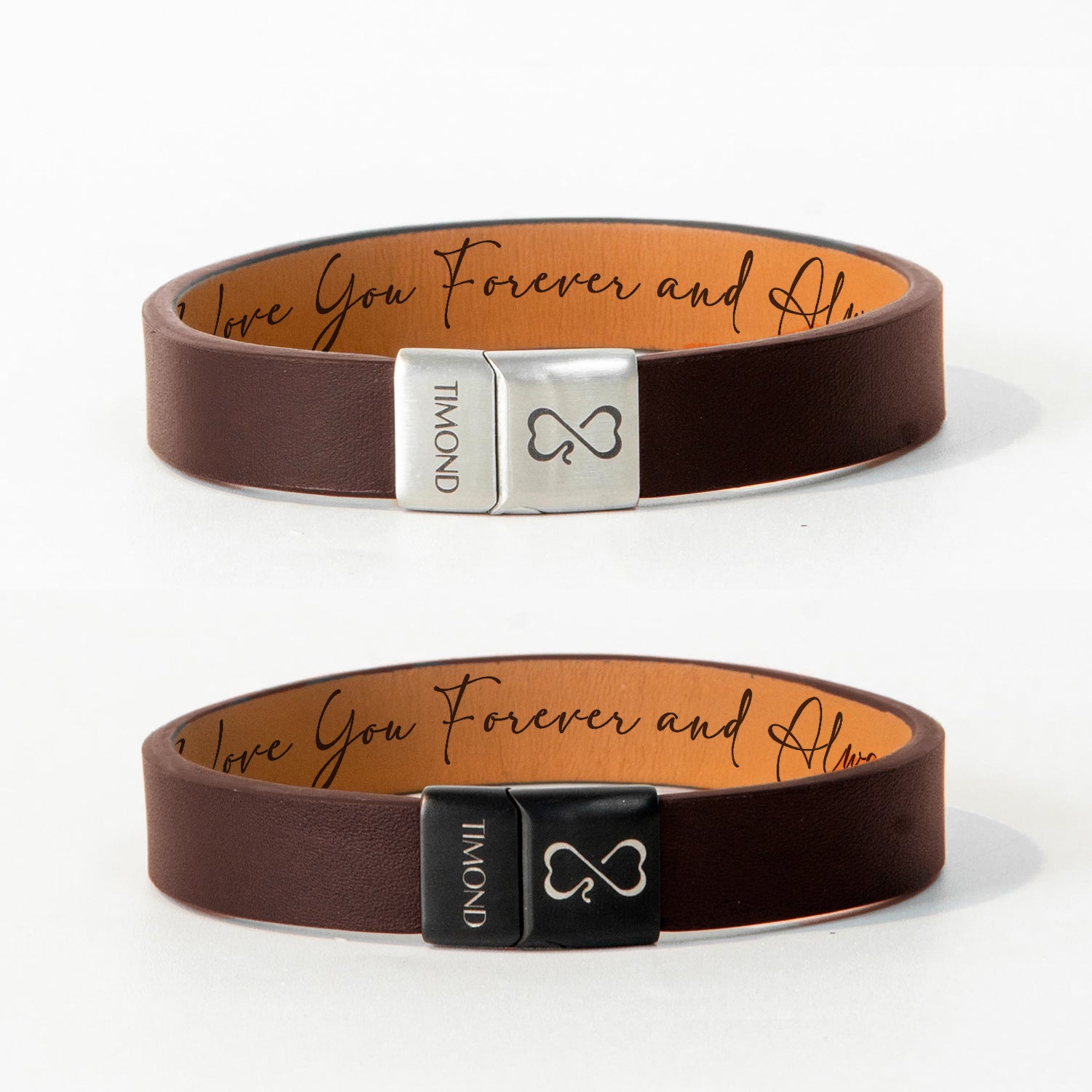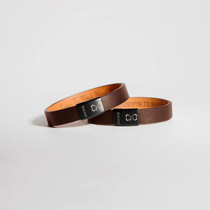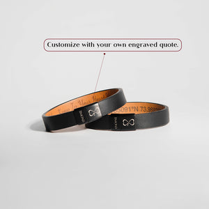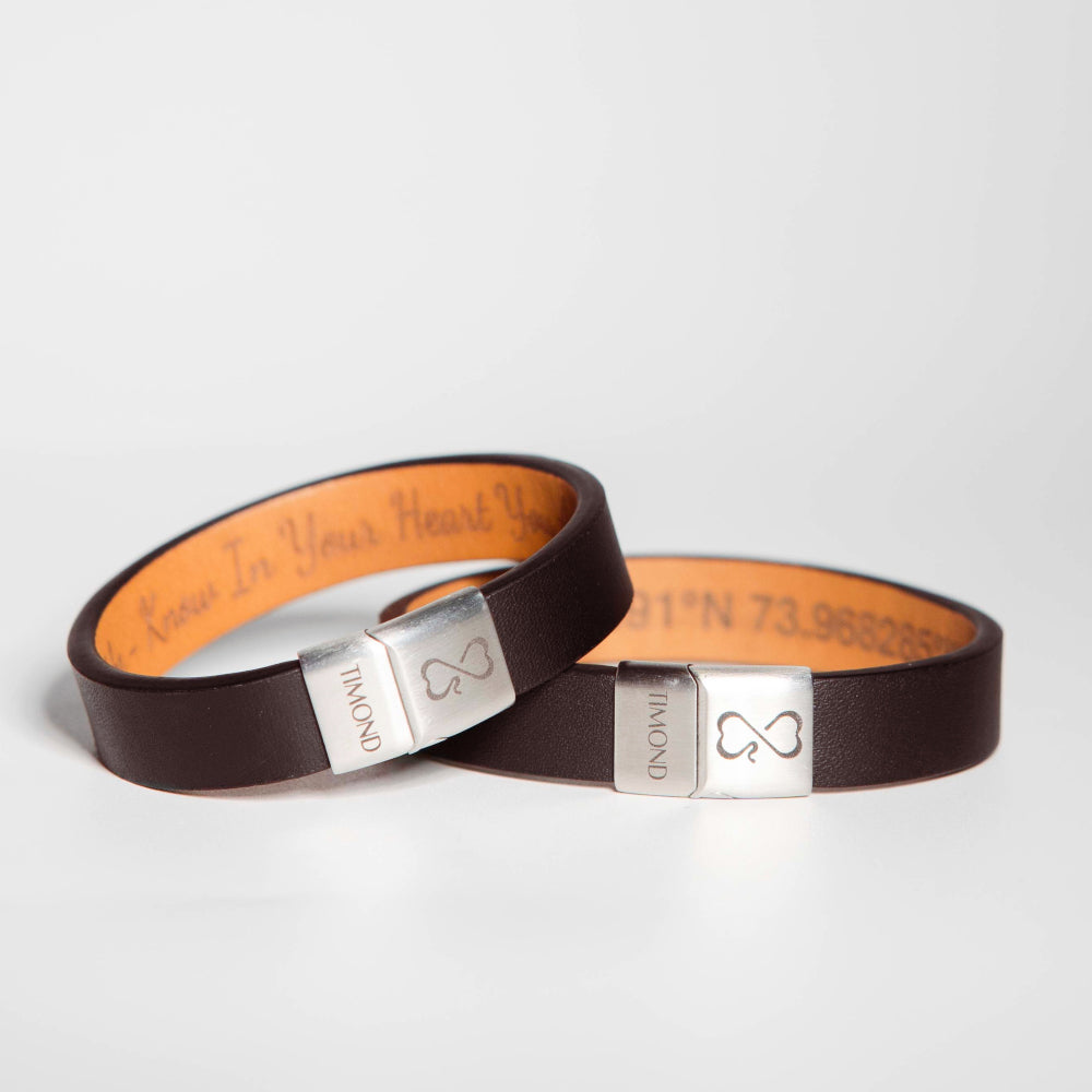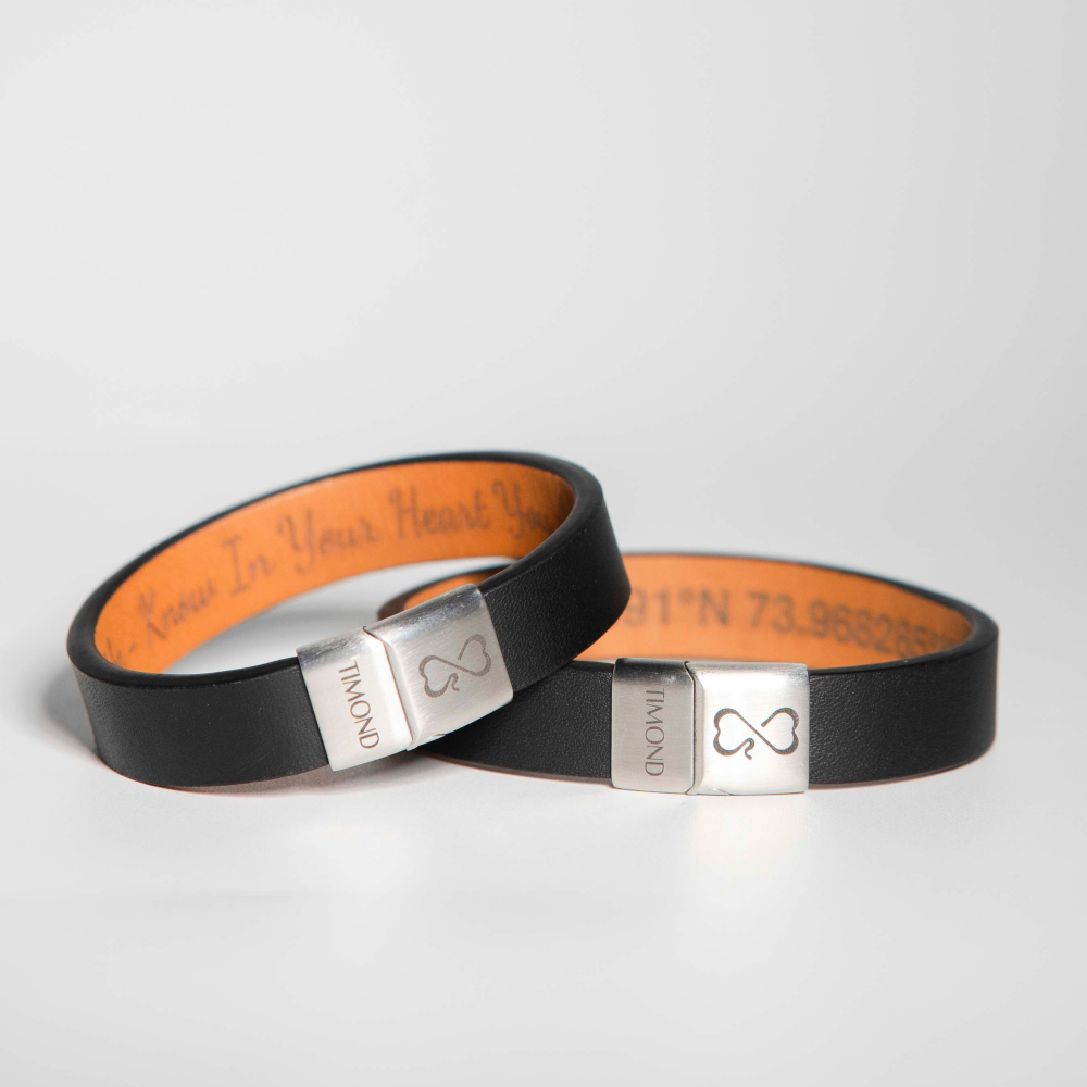 Handcrafted from premium box leather in black or brown, these bracelets are designed for couples who want to wear their love and keep their memories close. Personalize your bracelets with laser-engraved names, dates, or messages to make them truly unique.
