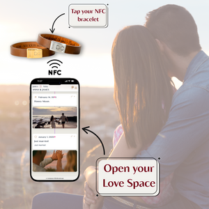 Each bracelet is integrated with an NFC chip that unlocks your private Love Space — a secure digital sanctuary where you and your partner can store photos, notes, milestones, and special memories.