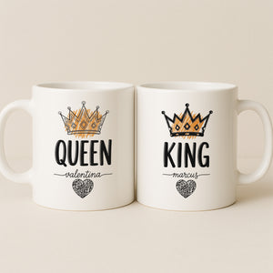 Set of 2 mugs: one reads “King” with a crown and your chosen name, the other “Queen” with a crown and custom name below.