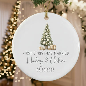 Celebrate your first holiday as a married couple with this elegant heart-shaped ceramic ornament. Featuring a beautifully illustrated Christmas tree surrounded by soft gold accents and the phrase “First Christmas Married,” it perfectly captures the warmth, love, and excitement of starting your new chapter together. Personalize it with your names and wedding date to create a timeless keepsake that will bring back cherished memories year after year. Each ornament arrives beautifully packaged in an elegant gift box, ready for gifting or shipping directly to the happy couple. Complimentary personalization and next-day shipping make it easy to celebrate love and togetherness this holiday season.