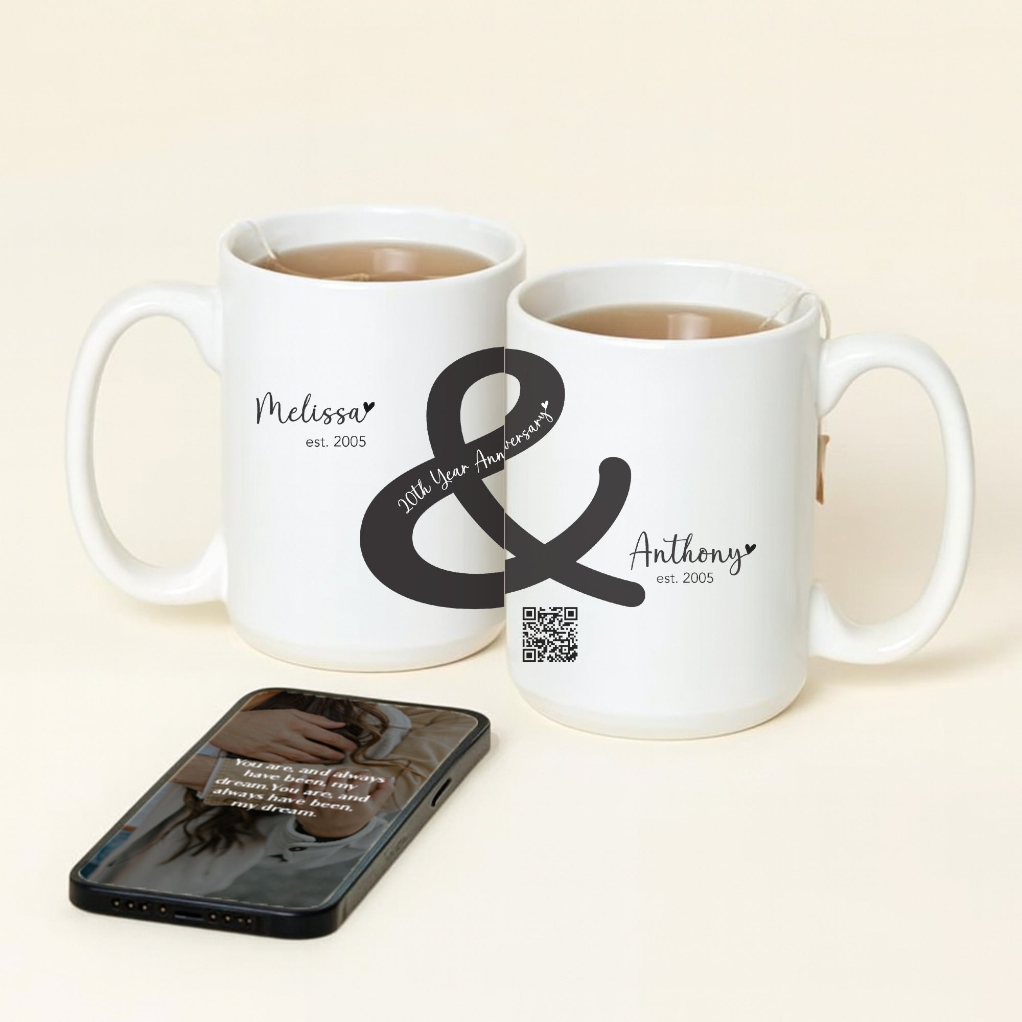 Mark 20 years of togetherness with the Timond Personalized Ampersand Mug—where your story and your names become art. Each morning, scan the discreet QR code for a new message, memory, or sweet surprise, making every day another celebration of your unique bond.