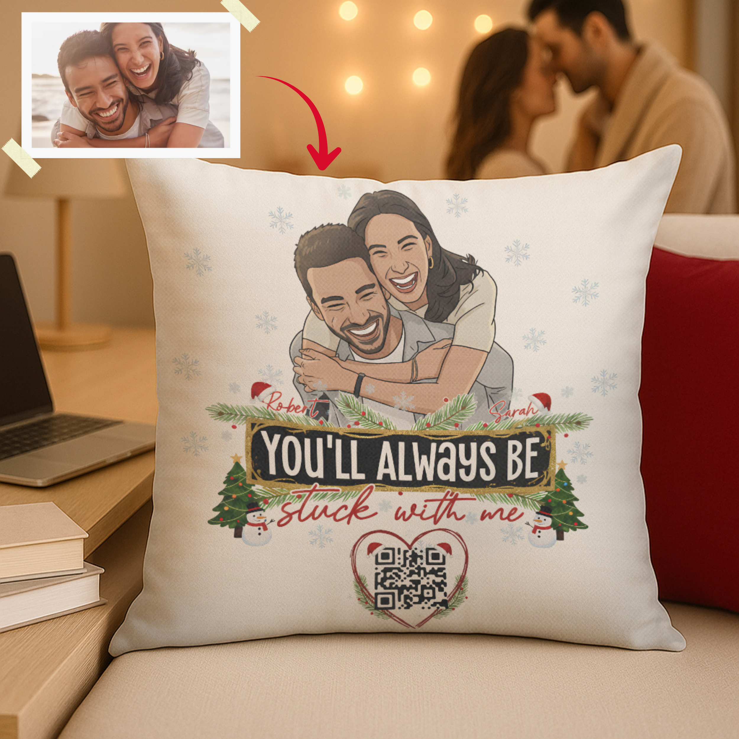 The “You’ll Always Be Stuck With Me” Personalized Interactive QR Throw Pillow Heartfelt Edition is a playful and loving reminder that your partner is stuck with you — for life! Upload your own couple photo, customize with names, và nickname, and enjoy festive details plus a heart-shaped QR code that unlocks a rotation of romantic, funny quotes every time you scan. A keepsake that guarantees love and laughter through every season.