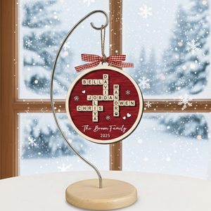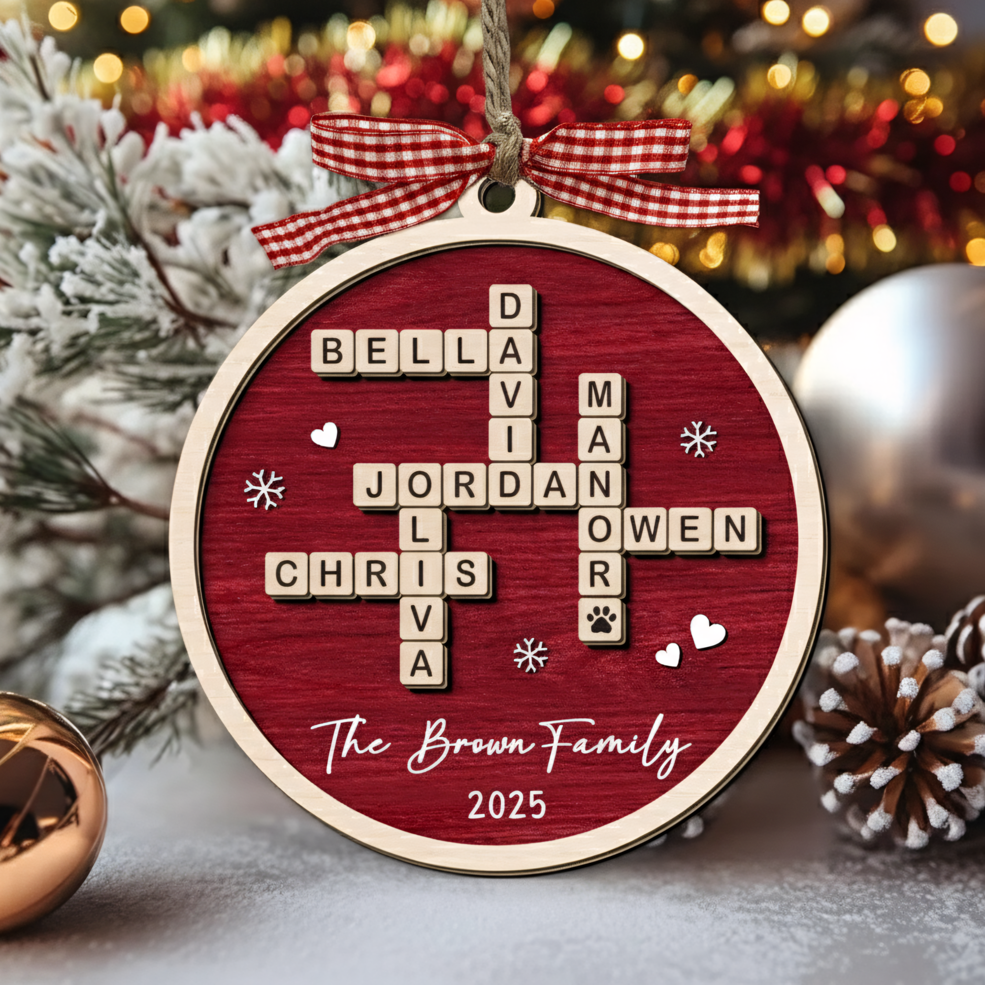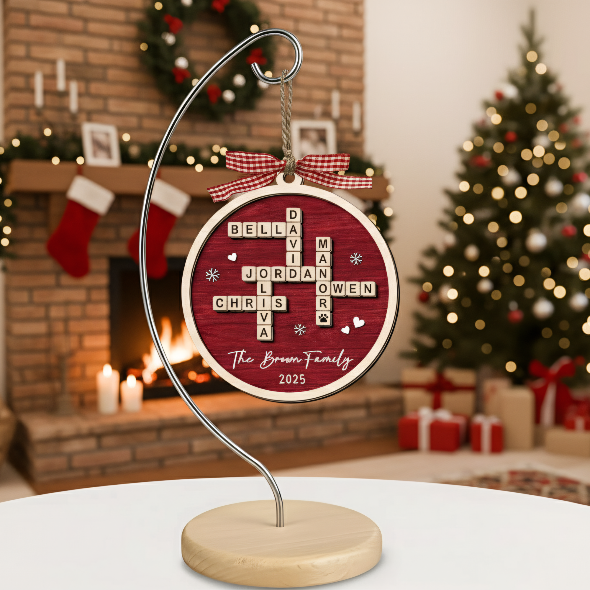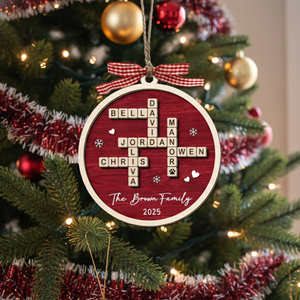 Celebrate your family this Christmas with a beautifully crafted Personalized Family Ornament, designed in a charming Scrabble-style layout with your family members’ names and last name. The elegant 2-layered wood design creates a stunning 3D appearance that adds depth and character to any holiday tree or display.