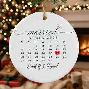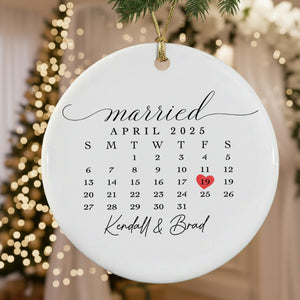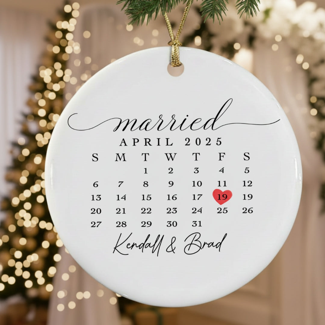 Celebrate the day your forever began with this elegant ceramic calendar ornament, beautifully designed to mark the exact date you said “I do.” Featuring a clean, timeless layout with the word “Married” in elegant script, your custom month, year, and wedding day highlighted by a soft heart accent, this ornament captures one of life’s most meaningful moments. Personalized with your names and wedding date, it’s a heartfelt keepsake that transforms your love story into a lasting holiday treasure. Perfect for displaying on your Christmas tree or gifting to newlyweds, this ornament serves as a beautiful reminder of your special day, year after year. Each piece arrives in an elegant gift box, ready for gifting or shipping directly to the couple. Complimentary personalization and next-day shipping make it effortless to celebrate love this holiday season.