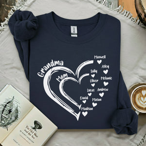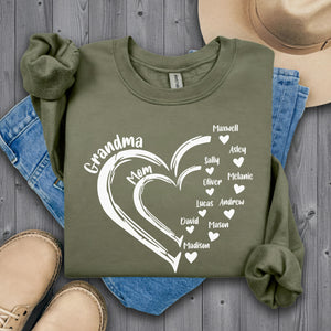 Show the world the love that spans generations with this Personalized Grandma & Mom Heart Sweatshirt. Featuring two intertwined hearts and the names of children or grandchildren, this cozy sweater beautifully symbolizes the unbreakable bond between mothers and grandmothers.