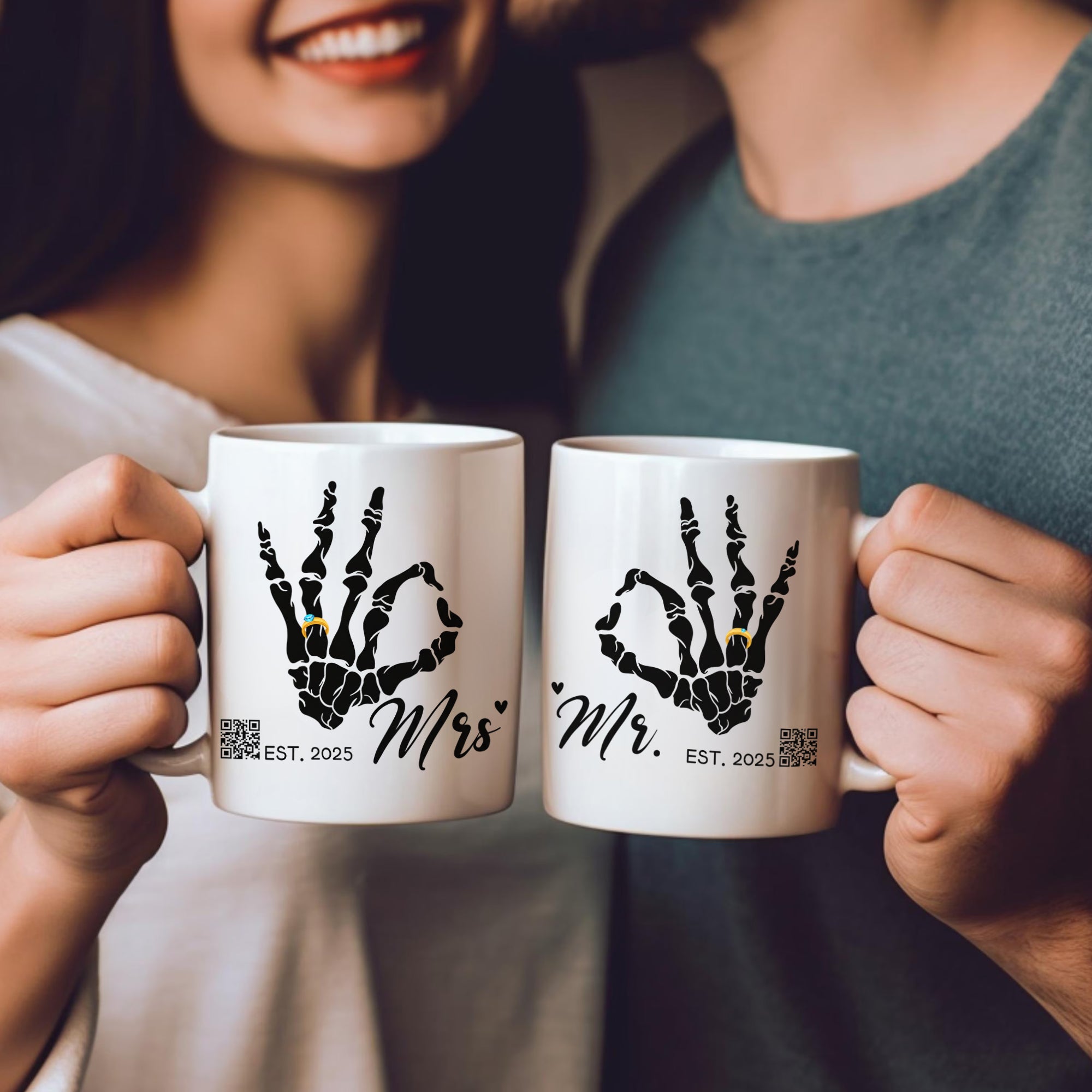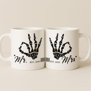 One high-quality ceramic mug printed on both sides: Mr. & Mrs. skeleton OK hand with golden ring, custom date, and interactive QR codes for personal messages.