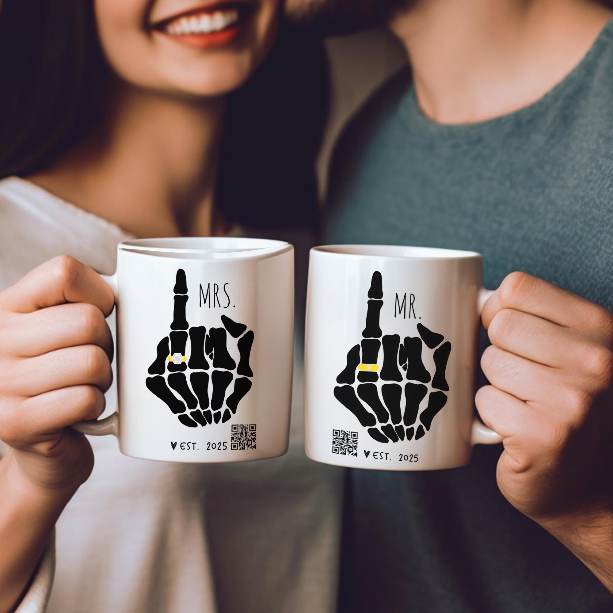 Add an extra edge to your coffee—order your Personalized MR & MRS Skeleton Wedding Mug with QR code today and make every day a little more memorable.
