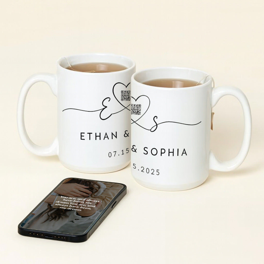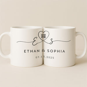 This elegant mug set showcases your initials joined by a heart, both mugs forming a complete design when placed side by side. Personalize with your names and anniversary date. Scan the QR code to reveal heartfelt notes or surprises for you and your partner—an experience designed just for the two of you.
