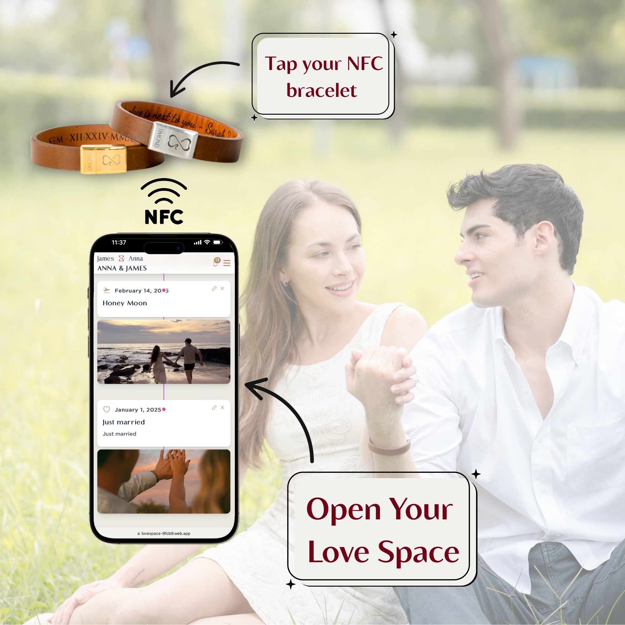 Your Timond bracelet has built-in NFC technology. Simply tap it with any smartphone and your private Love Space opens instantly—no apps, no downloads, no setup.