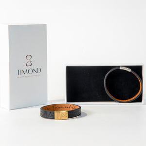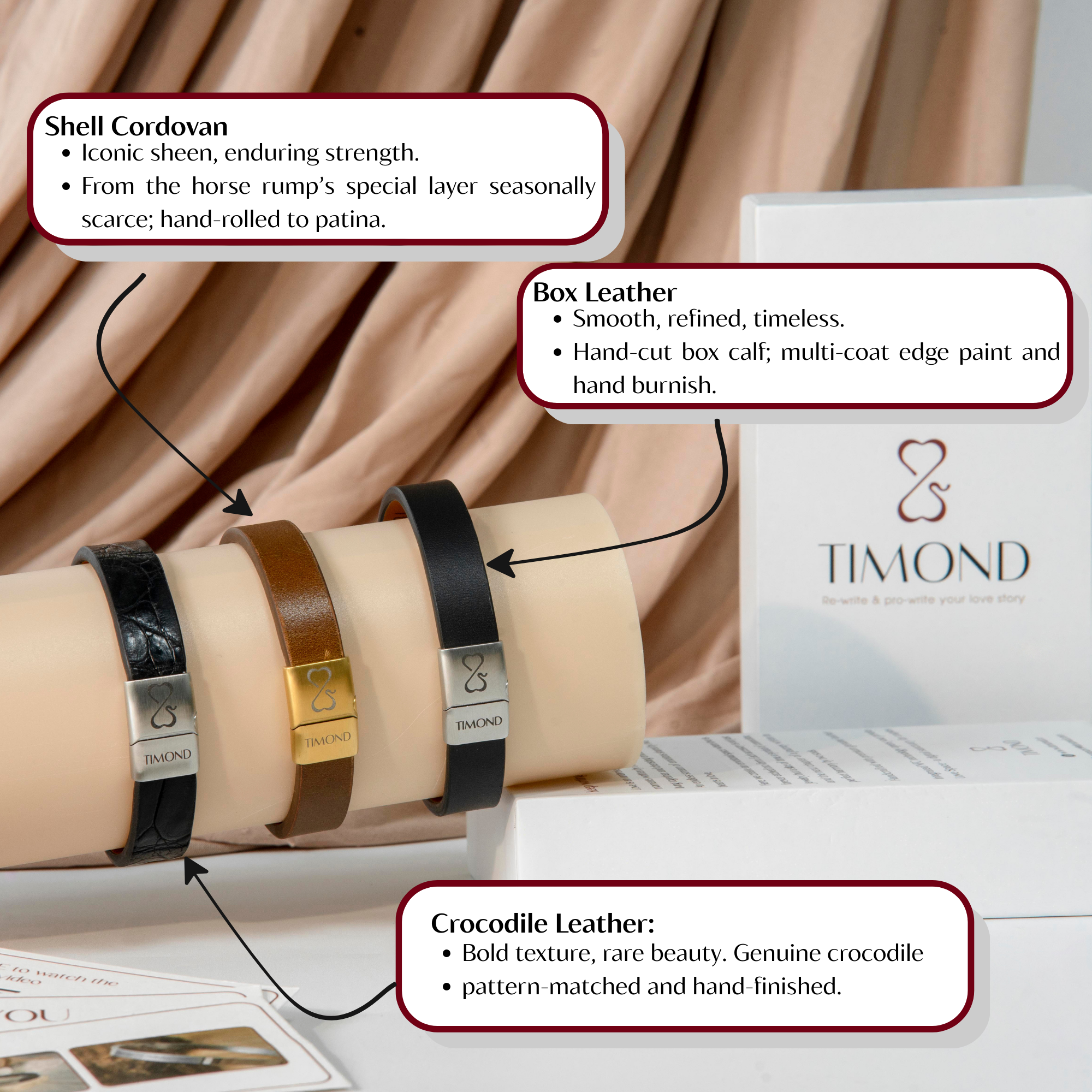 Celebrate your love with the Timond Crocodile Leather NFC Couple Bracelets — a premium set of two handcrafted bracelets designed for couples who value both luxury and connection. Made from genuine crocodile leather and engraved with your personalized message, these bracelets represent timeless elegance and intimacy.