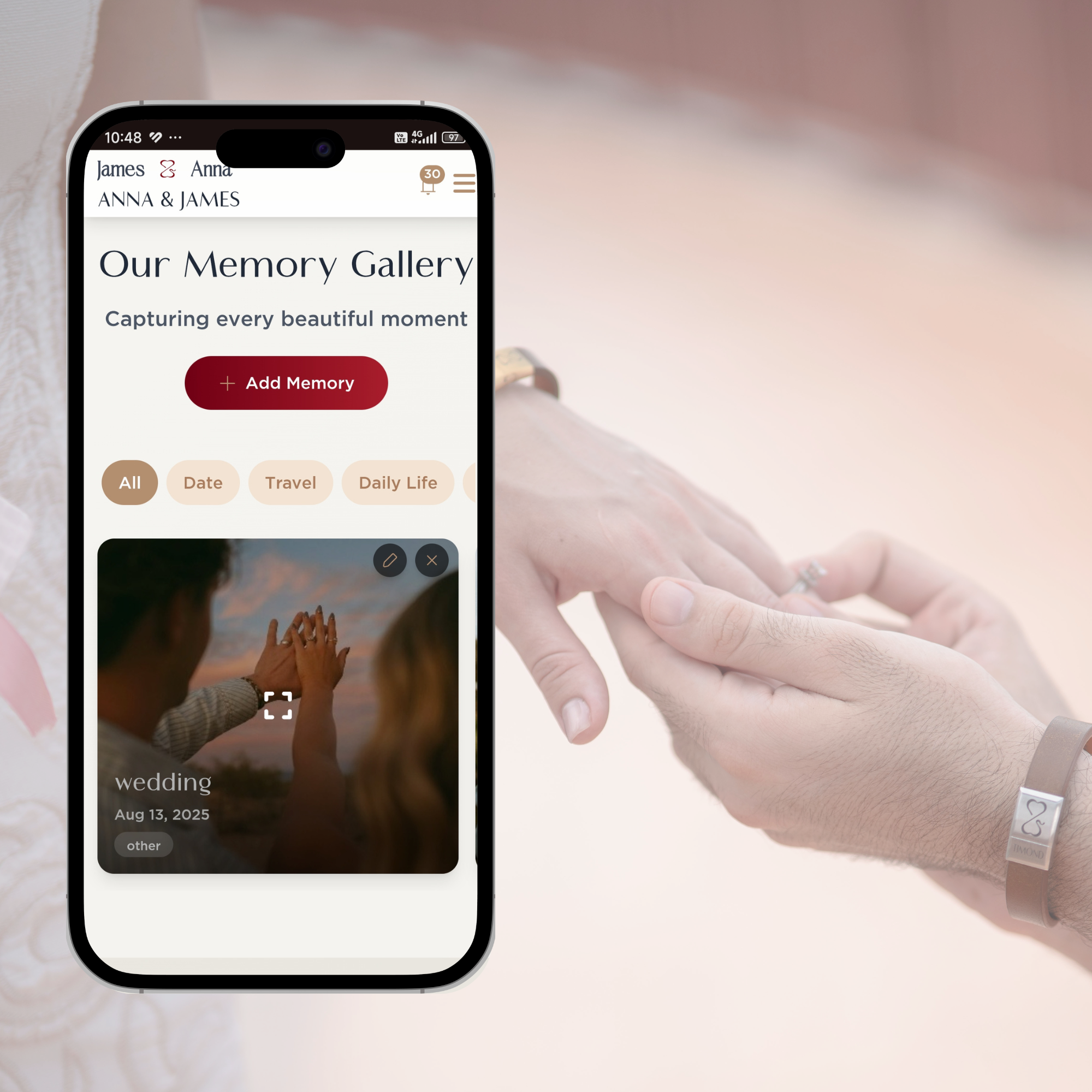 No app to download. Tap your bracelet to open your shared space for photos, notes, playlists, and milestones—just for the two of you.