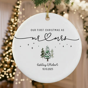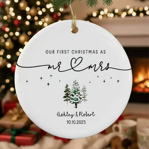 Celebrate your first Christmas as a married couple with this elegant round ceramic ornament, beautifully designed to capture the joy and love of your new beginning together. Featuring the romantic phrase “Our First Christmas as Mr & Mrs,” along with delicate greenery artwork and your personalized names and wedding date, this ornament becomes a lasting reminder of one of life’s sweetest milestones. Thoughtfully crafted to blend modern simplicity with heartfelt sentiment, it’s a perfect keepsake to adorn your tree year after year. Each ornament arrives in an elegant gift box, ready for gifting or shipping directly to the happy couple. With complimentary personalization and next-day shipping, it’s an effortless yet meaningful way to celebrate love and togetherness this holiday season.