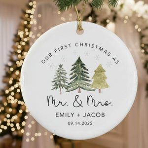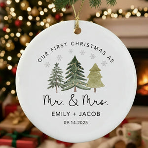 Celebrate your first Christmas as a married couple with this elegant round ceramic ornament, beautifully designed to capture the joy and love of your new beginning together. Featuring the romantic phrase “Our First Christmas as Mr & Mrs,” along with delicate greenery artwork and your personalized names and wedding date, this ornament becomes a lasting reminder of one of life’s sweetest milestones. Thoughtfully crafted to blend modern simplicity with heartfelt sentiment, it’s a perfect keepsake to adorn your tree year after year. Each ornament arrives in an elegant gift box, ready for gifting or shipping directly to the happy couple. With complimentary personalization and next-day shipping, it’s an effortless yet meaningful way to celebrate love and togetherness this holiday season.