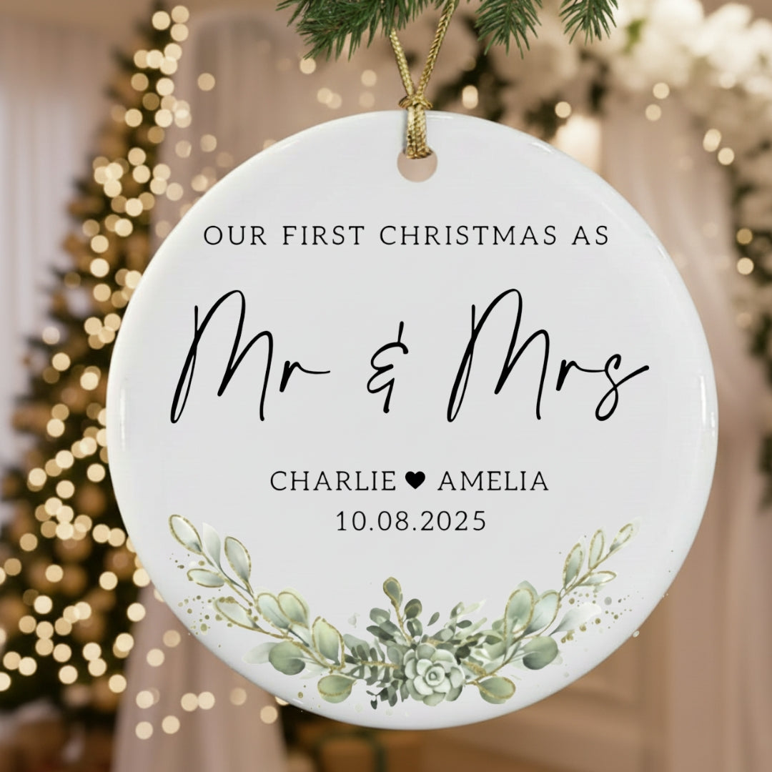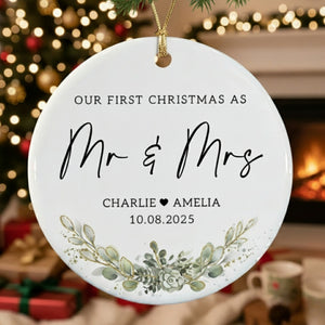 Celebrate your first Christmas as a married couple with this elegant round ceramic ornament, beautifully designed to capture the joy and love of your new beginning together. Featuring the romantic phrase “Our First Christmas as Mr & Mrs,” along with delicate greenery artwork and your personalized names and wedding date, this ornament becomes a lasting reminder of one of life’s sweetest milestones. Thoughtfully crafted to blend modern simplicity with heartfelt sentiment, it’s a perfect keepsake to adorn your tree year after year. Each ornament arrives in an elegant gift box, ready for gifting or shipping directly to the happy couple. With complimentary personalization and next-day shipping, it’s an effortless yet meaningful way to celebrate love and togetherness this holiday season.