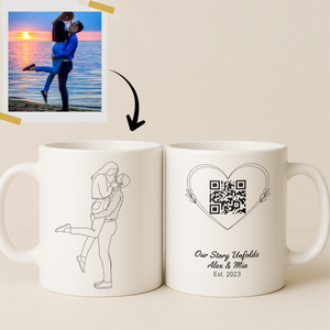 Turn your favorite moment into timeless art with our Personalized Line Art Couple Mug. Your uploaded photo is transformed into a minimalist line sketch on one side, while the other side features your names, a special year, and a heart-shaped QR code that unlocks a private message, song, video, or memory.