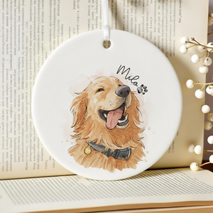 The Christmas Watercolor Pet Portrait Ornament for Dog Lovers – Custom Photo Ceramic Keepsake turns your pet’s photo into a heartwarming holiday accent. Printed on smooth ceramic with gentle watercolor tones and your pet’s name, it celebrates the joy and loyalty that brighten every festive season.