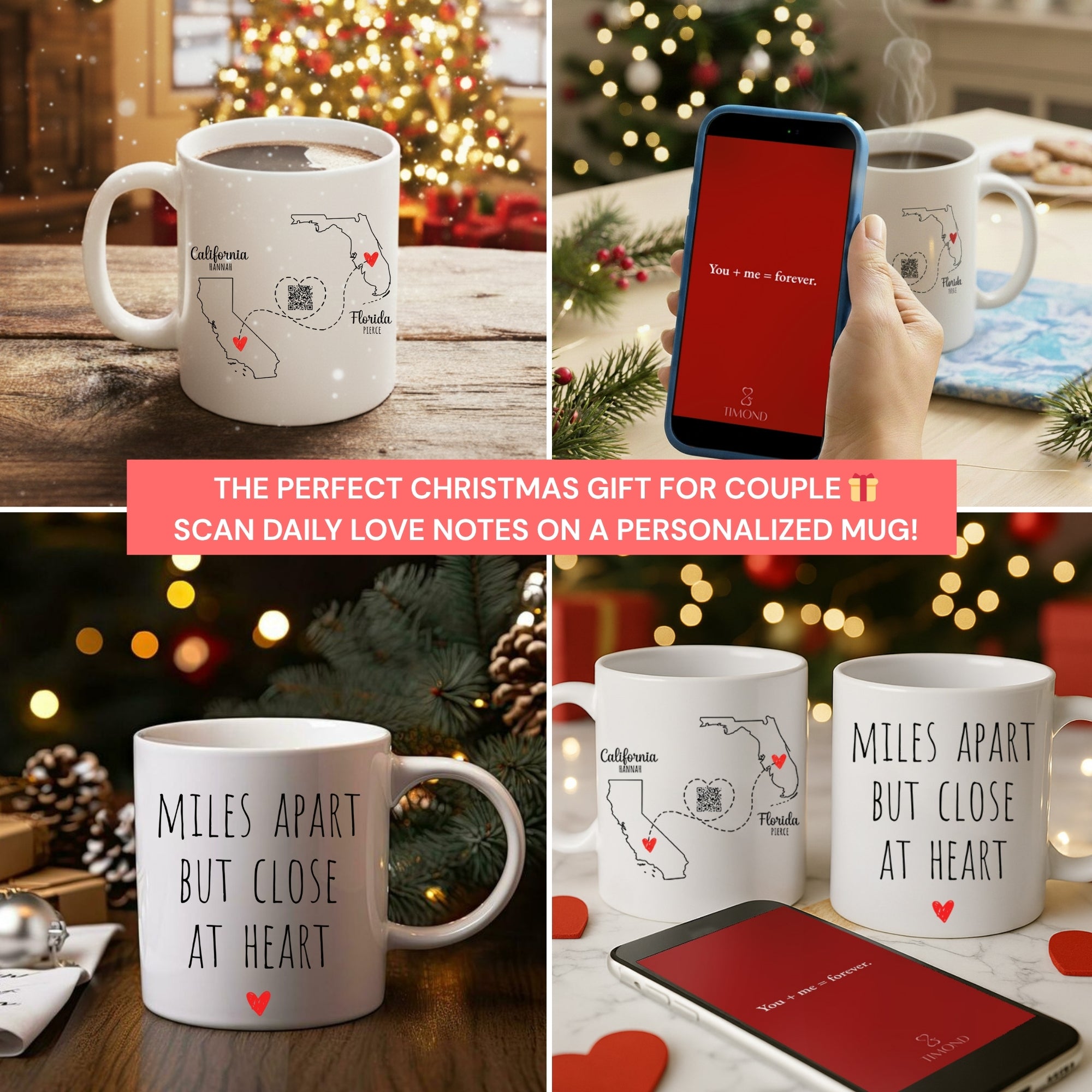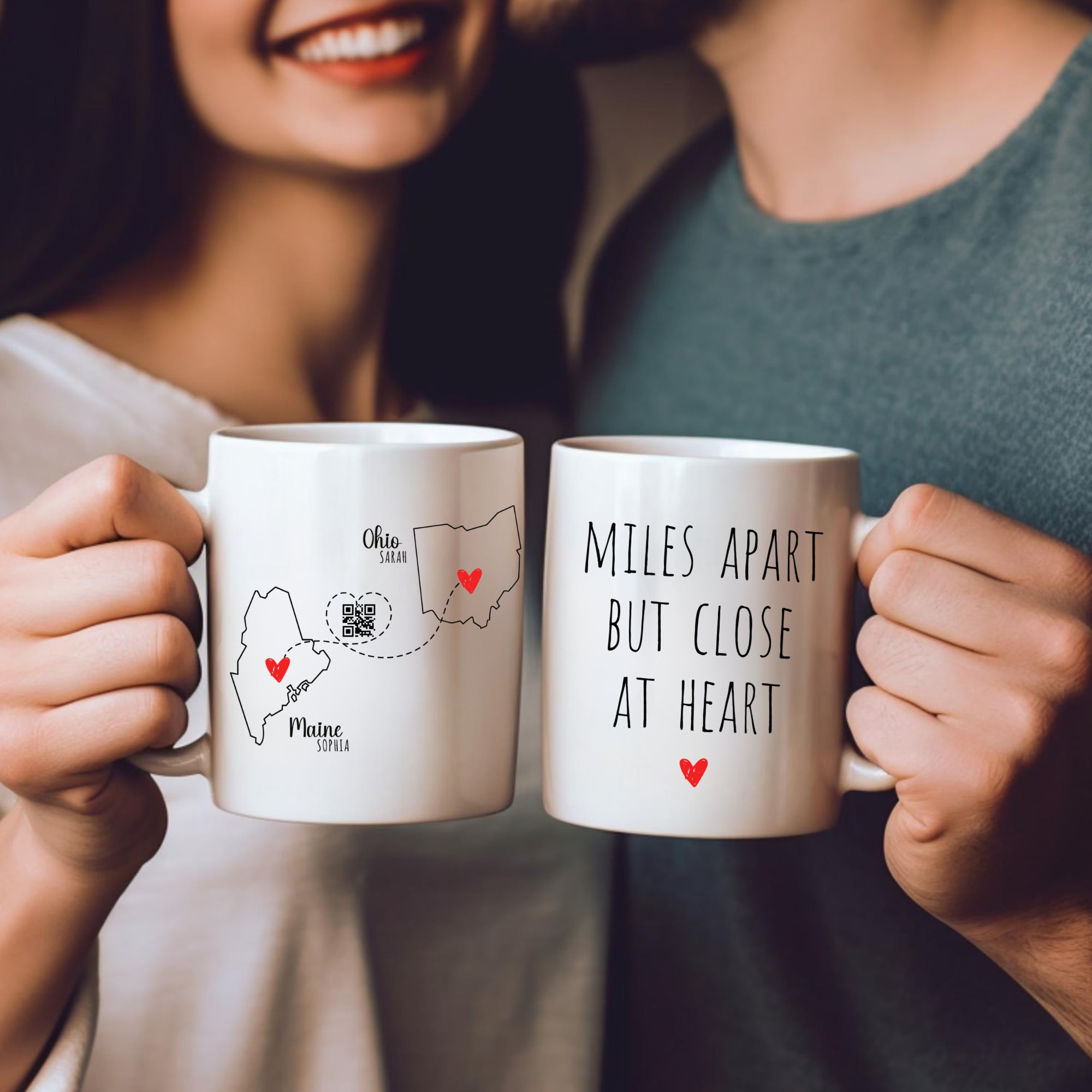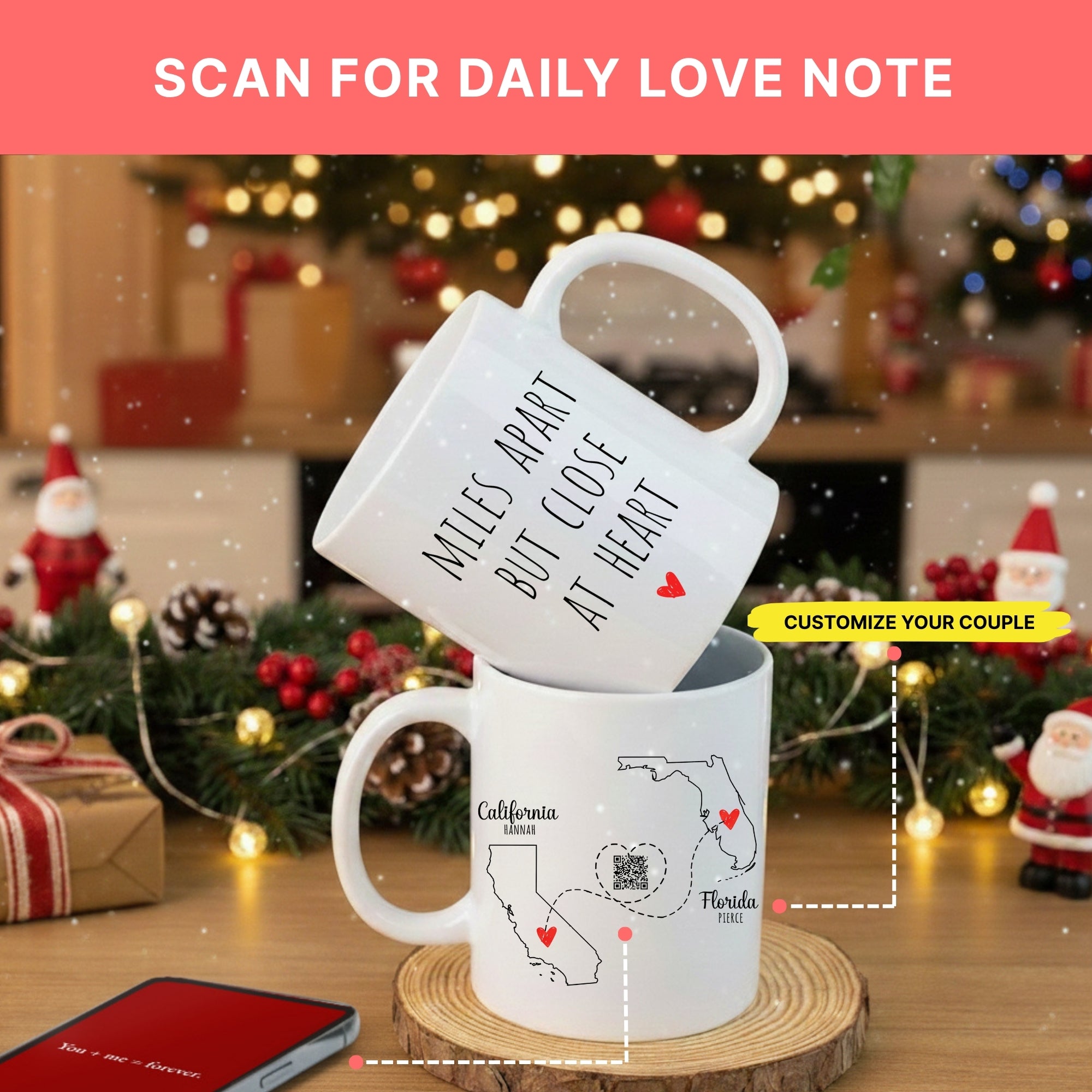 Each mug features a personalized map with your names and locations, connected by a path and heart icons. The quote "Miles Apart But Close At Heart" brings comfort when you can’t share your mornings—while scanning the QR code reveals a new love note, photo, or message from your partner.