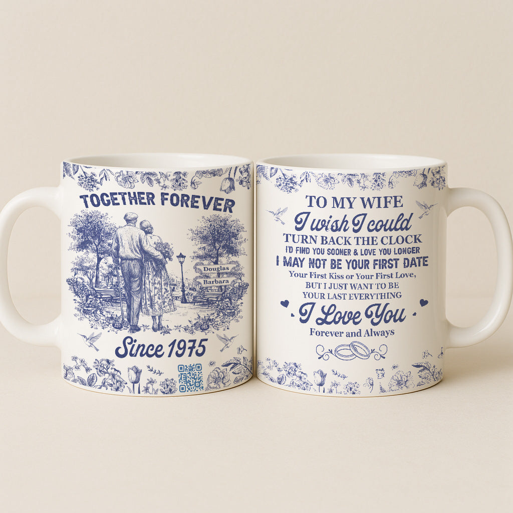 Celebrate your love story with this Personalized “Together Forever” Couple Mug. Featuring a vintage-style illustration, your custom names, a special year, and a scannable QR code that unlocks a romantic message, this mug is a timeless way to honor your journey together.