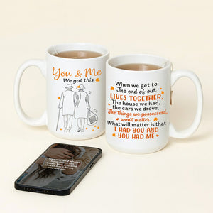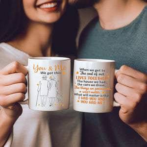 This heartwarming mug set features a touching illustration of an older couple walking side by side, symbolizing enduring love and companionship. The meaningful message reminds you what truly matters: “When we get to the end of our lives together... What will matter is that I had you and you had me.”